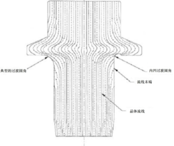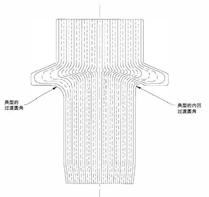 注:壓縮區(qū)是鍛造過程中產(chǎn)生的材料晶體流。這些是基本金屬的壓實流動晶體,并在鍛造過程中流動形成零件形狀。整個壓實金屬流線應(yīng)位于支承面或支承面上方,因為該區(qū)域包含可能導(dǎo)致制造和零件性能不良的最大內(nèi)應(yīng)力。