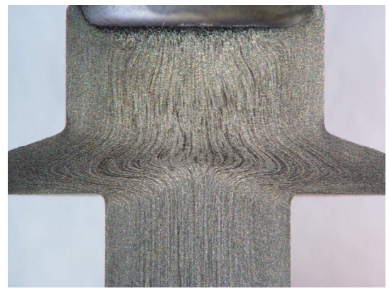 注:腐蝕后,金剛石砂輪上的輕微“暴露”拋光會消除流線脊上的一些凸起區(qū)域。該工藝改善了腐蝕流線較暗根部與光亮或拋光波峰之間的對比度,來改進評估。